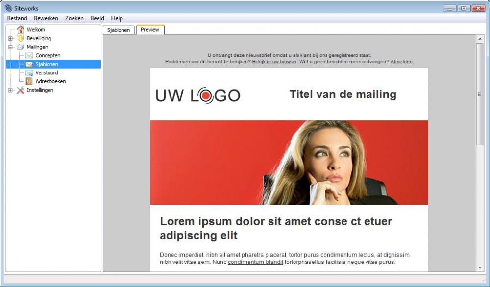 Siteworks heeft hierin al een standaard sjabloon toegevoegd dat zelf naar eigen smaak aangepast kan worden met een Logo en een Sfeerbeeld.