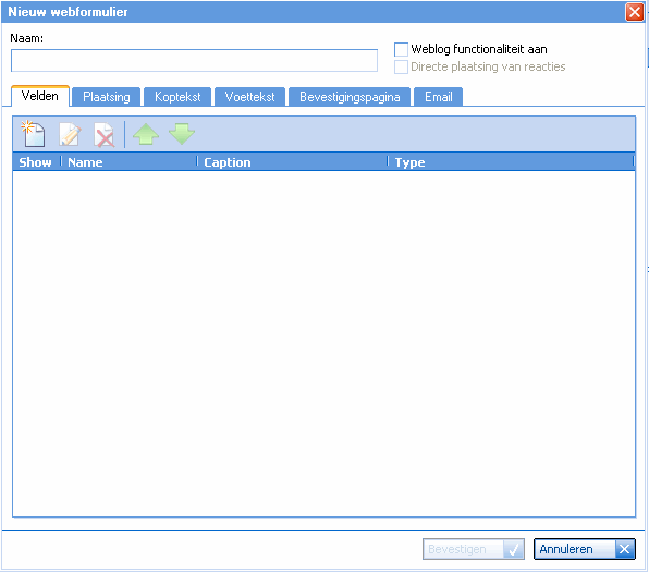 Er verschijnt nu een nieuw venster: het Webformulier eigenschappen venster. (klik op de afbeelding rechtsboven om een vergroting te bekijken). U kunt nu uw webformulier een passende naam geven bij het veld "Naam".