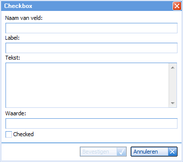 Door het aanvinken (aanklikken van het blokje) kan de gebruiker zijn keuzeoptie bepalen. In het "tekst" veld geeft u een omschrijving van de checkbox.