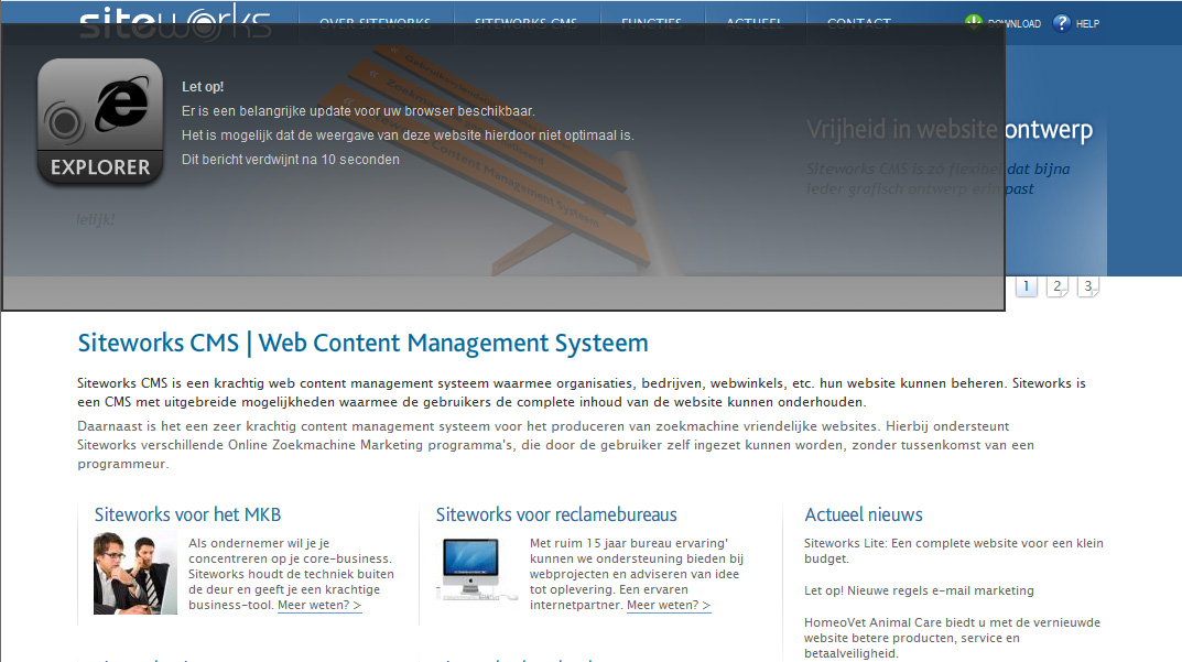 We bieden onze Siteworks gebruikers de mogelijkheid om hun bezoekers te attenderen over de beschikbaarheid van een nieuwe browser. Bij een bezoek aan uw site worden ze door een melding hiervan op de hoogte gebracht.